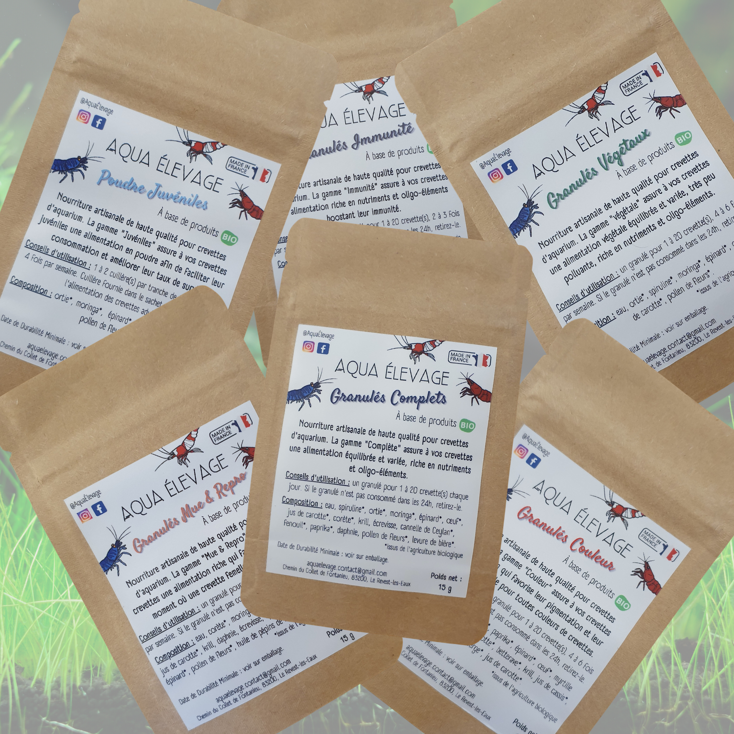 il est fortement conseillé de varier la nourriture de vos crevettes autant que possible afin de maximiser les effets bénéfiques qu’elle procure. Ceci est d’autant plus important pour les éleveurs de crevettes souhaitant faire de la reproduction et améliorer leur sélection. Ainsi, nous vous recommandons d’utiliser différents aliments de la marque AquaÉlevage car ils sont conçus pour agir en synergie. Varier la nourriture et utiliser des produits de bonne qualité est essentiel pour vos crevettes.